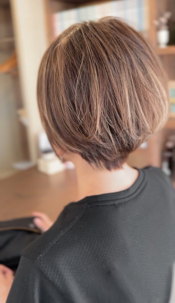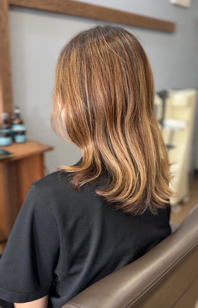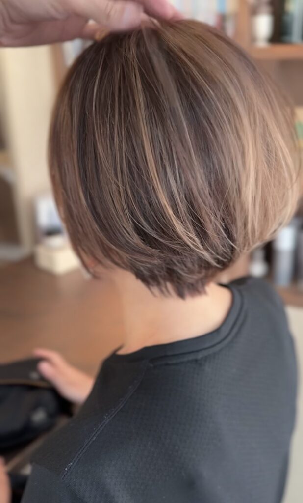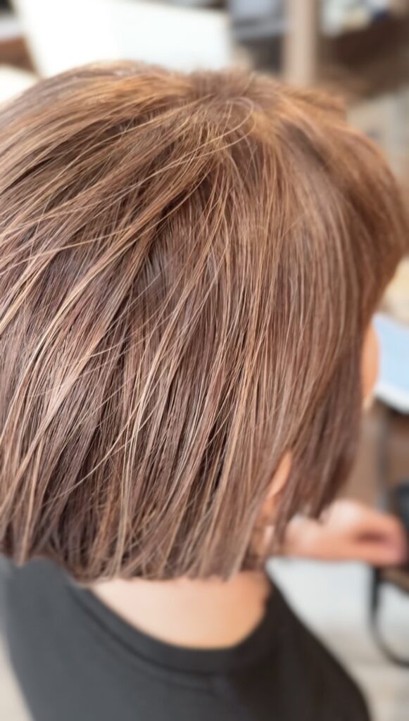 コントラスト高めの「がっつりハイライトいれました!」的な雰囲気とは違い、元々の白髪も活かしつつ馴染ませた仕上がりになります。