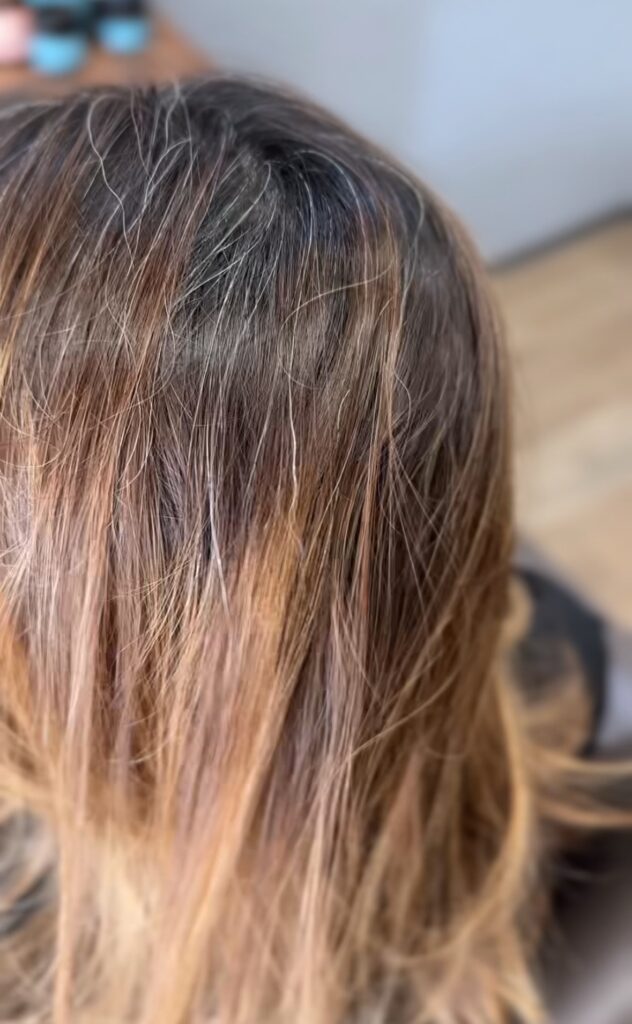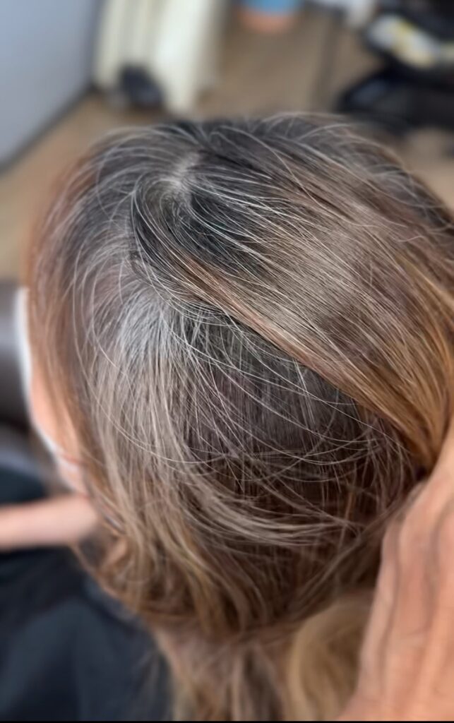 今回(こちらのお客様はいつも)はトップに数枚のホイルでハイライトを入れて、全体も明るめのベージュ系のカラーで白髪をぼかしたヘアスタイルになります。