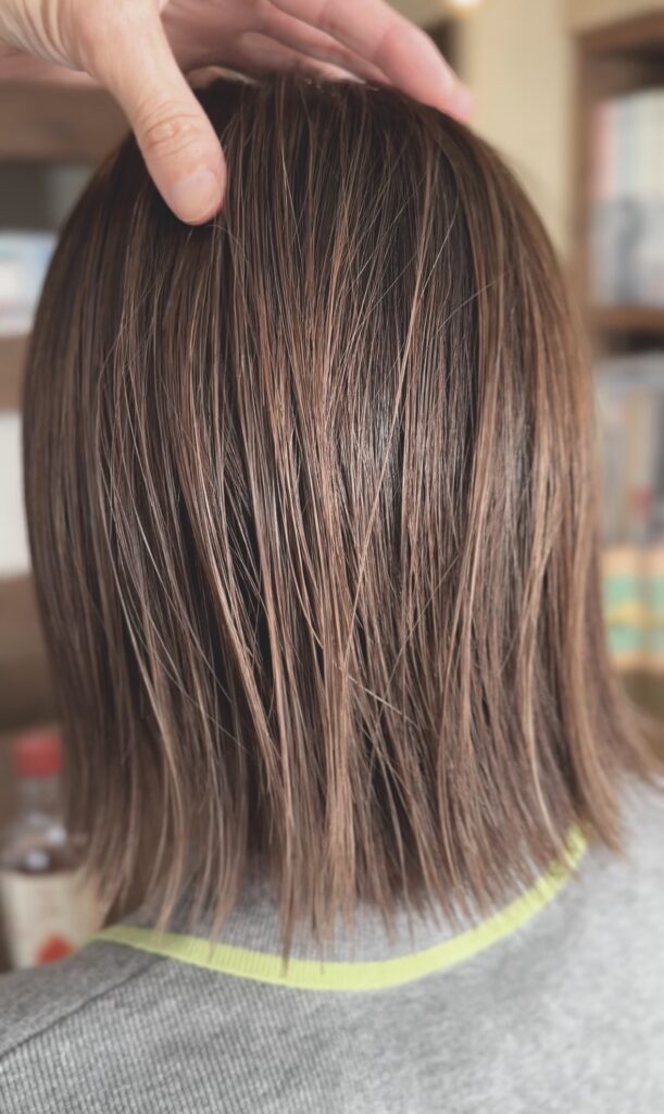 ちなみに当店では毛先まで染める場合でも、ダメージは最小限に抑えるような処方で薬剤を作りますのでさほどダメージは感じません。